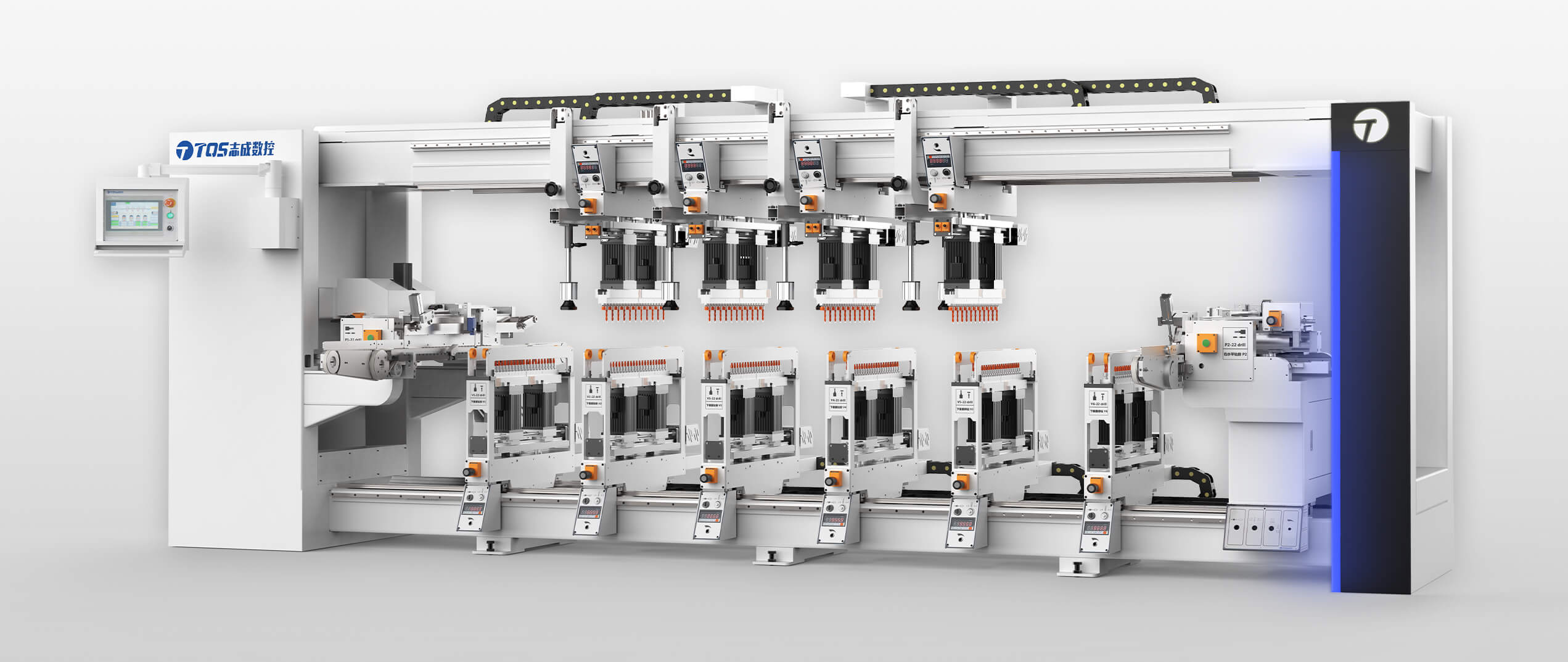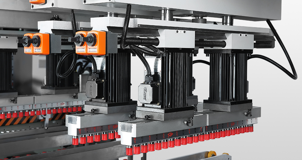 适用于板式家具生产过程中一次工序完成四面钻孔作业,上垂直钻排、左右水平钻排、下垂直钻排自由组合工作,最多每分钟可加工13-16件板,采用皮带传输送料方式,配备滚珠丝杆传动定位装置确保定位精准,上下垂直钻排配备数字显示器,逻辑控制编程PLC控制系统。