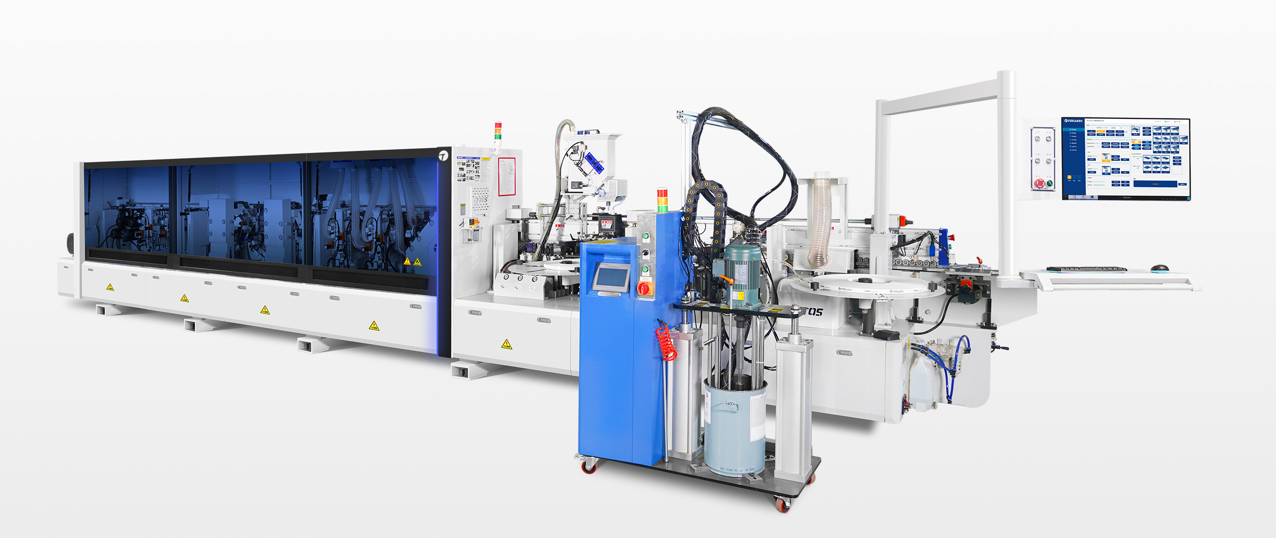 装置单元:分离剂、预铣、烤灯、免清洗PUR系统、上置快速溶胶系统、六轮压贴送带、双导轨齐头、粗修、气动精修1、气动精修2、四刀仿型跟踪、气动精刮1、气动精刮2、平刮边、清洗剂、抛光1、抛光2